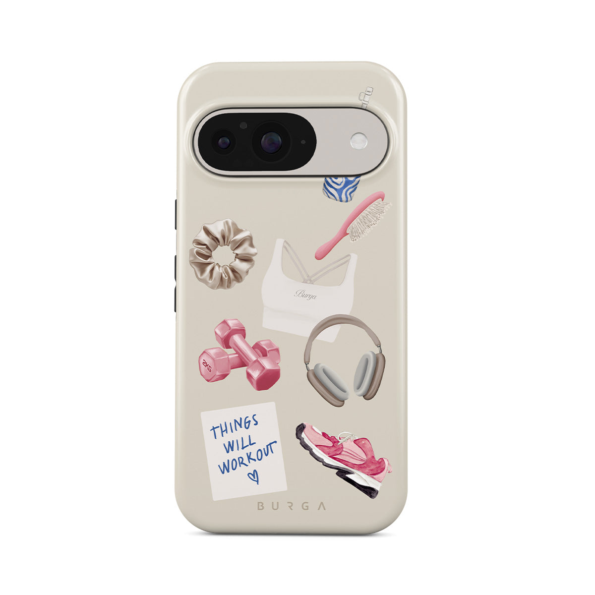 This design features: dumbbells, headphones, tumbler, hairbrush, pink trainers, sports bra, crunchie, "Things Will Work Out" sticky note