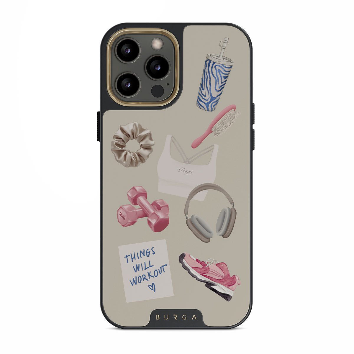 This design features: dumbbells, headphones, tumbler, hairbrush, pink trainers, sports bra, crunchie, "Things Will Work Out" sticky note