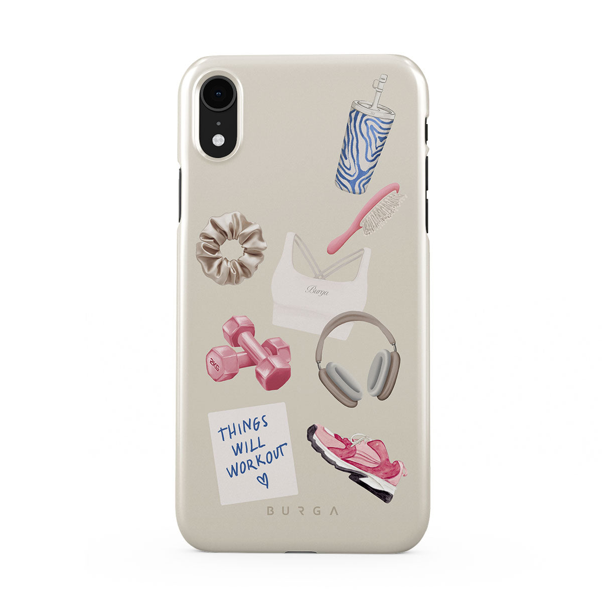 This design features: dumbbells, headphones, tumbler, hairbrush, pink trainers, sports bra, crunchie, "Things Will Work Out" sticky note