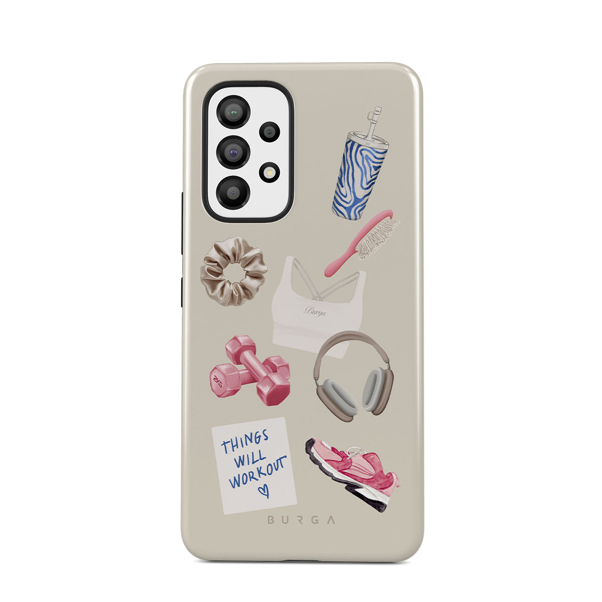 This design features: dumbbells, headphones, tumbler, hairbrush, pink trainers, sports bra, crunchie, "Things Will Work Out" sticky note