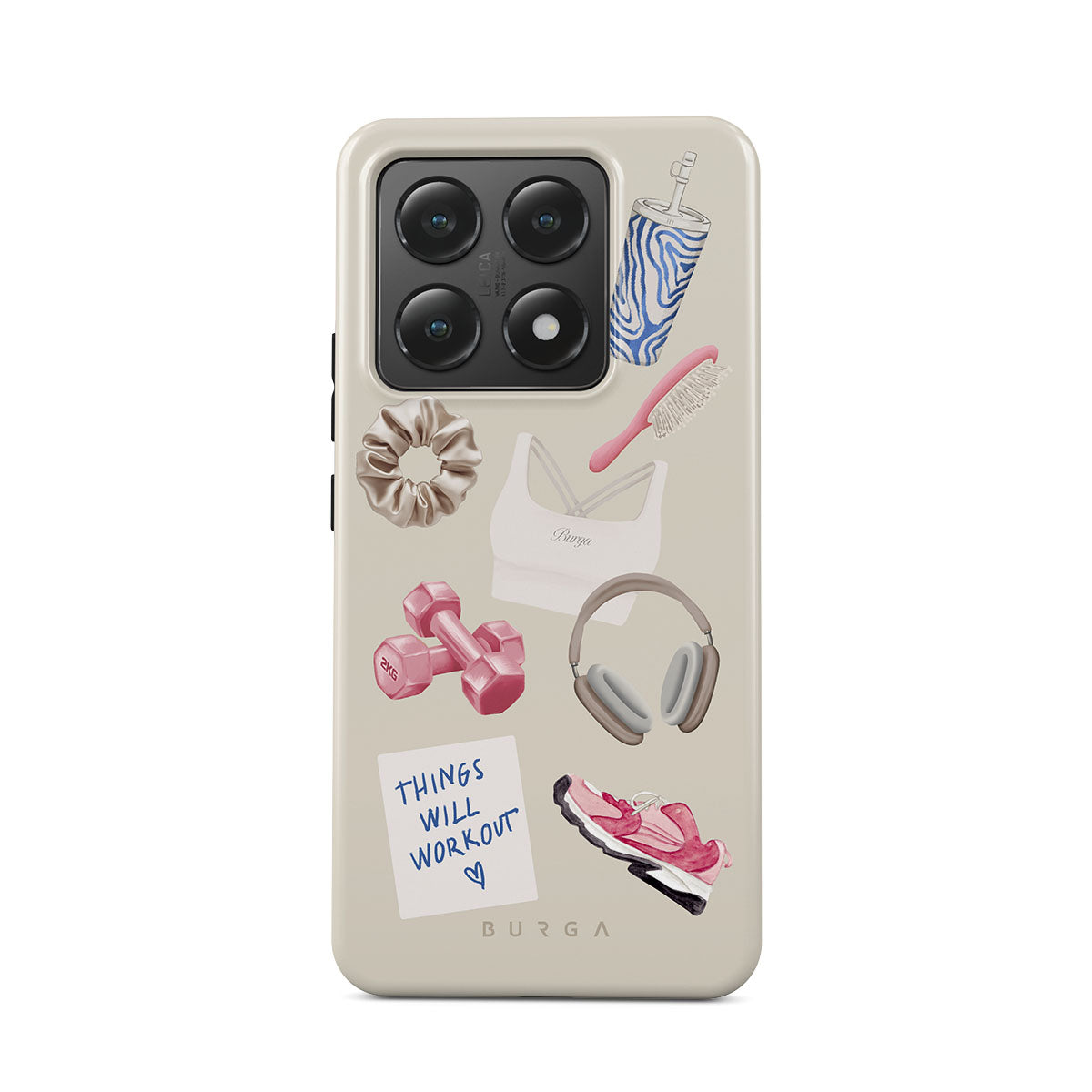 This design features: dumbbells, headphones, tumbler, hairbrush, pink trainers, sports bra, crunchie, "Things Will Work Out" sticky note