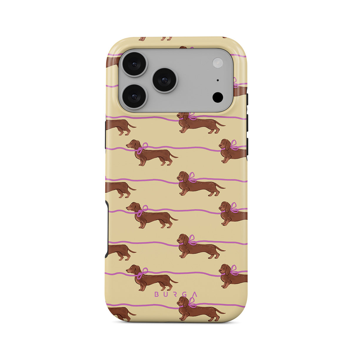 This iPhone 17 Pro Max phone case design doesn’t believe in time, only vibes. It features sassy sausage dogs with bows who, like you, are running 15 minutes behind—and blaming Mercury.
