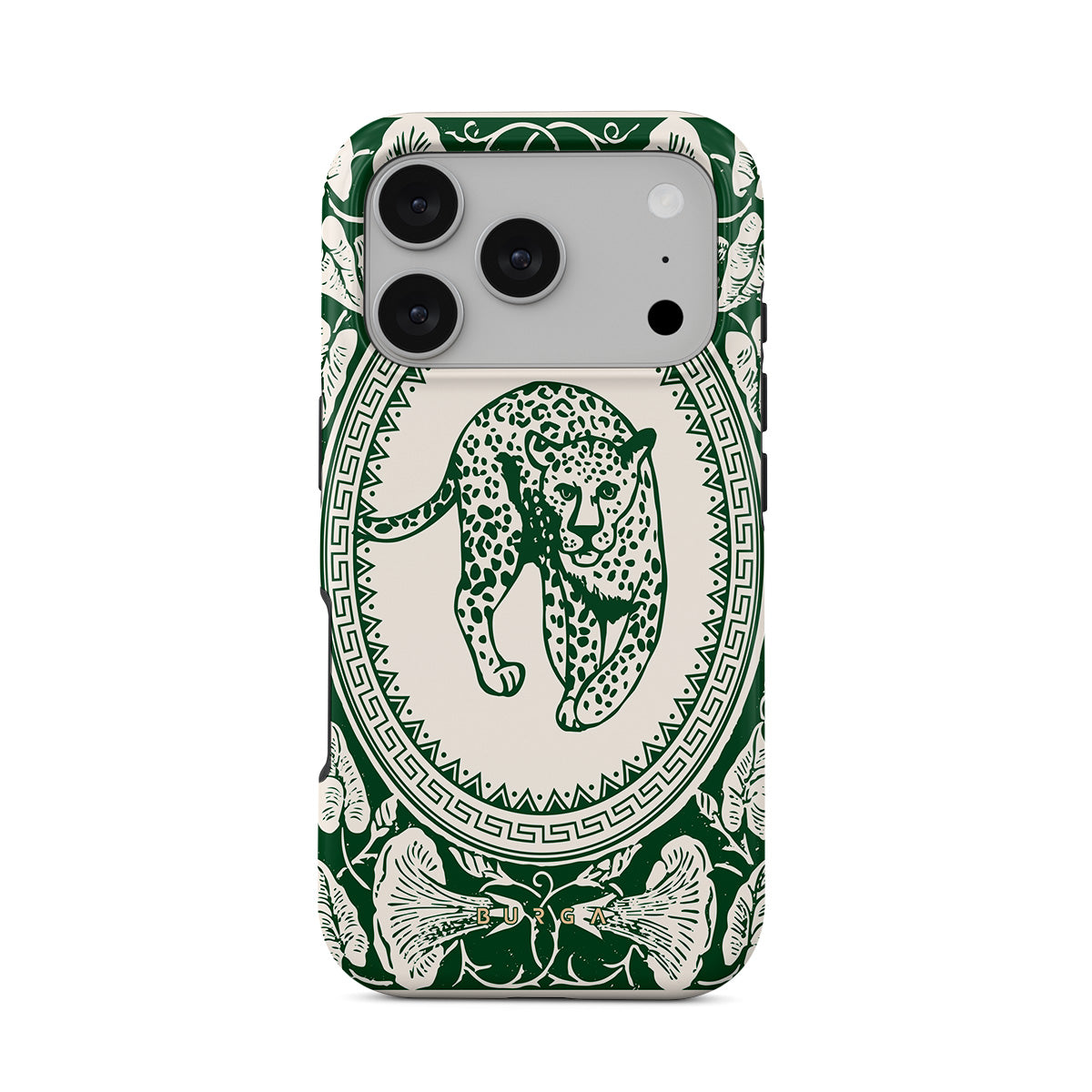 Our Antique iPhone 17 Pro phone case design—a nude canvas kissed by refined green contours, painting an eternal saga of elegance. Enthroned at its center is a regal leopard embraced by a tender floral caress. A nod to timeless opulence, this design captures the essence of vintage prestige.