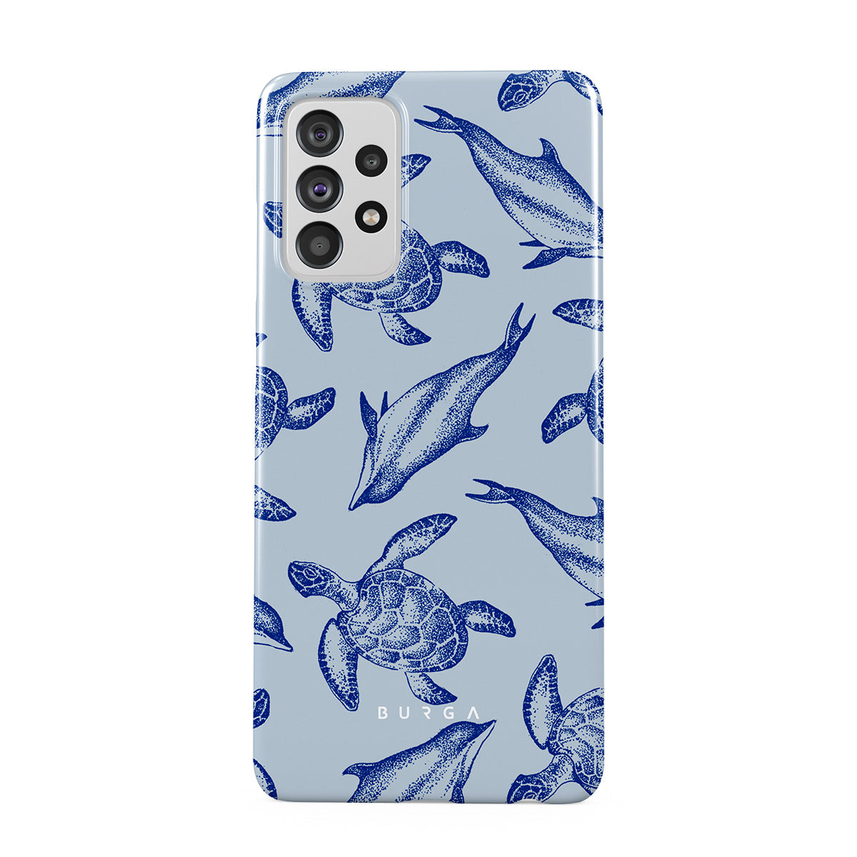 A beautiful design featuring lively turtles and dolphins playfully dancing in serene light blue water. Dive into the ocean's rhythm with our Aquatic Dance Samsung Galaxy A72 4G / 5G case.
