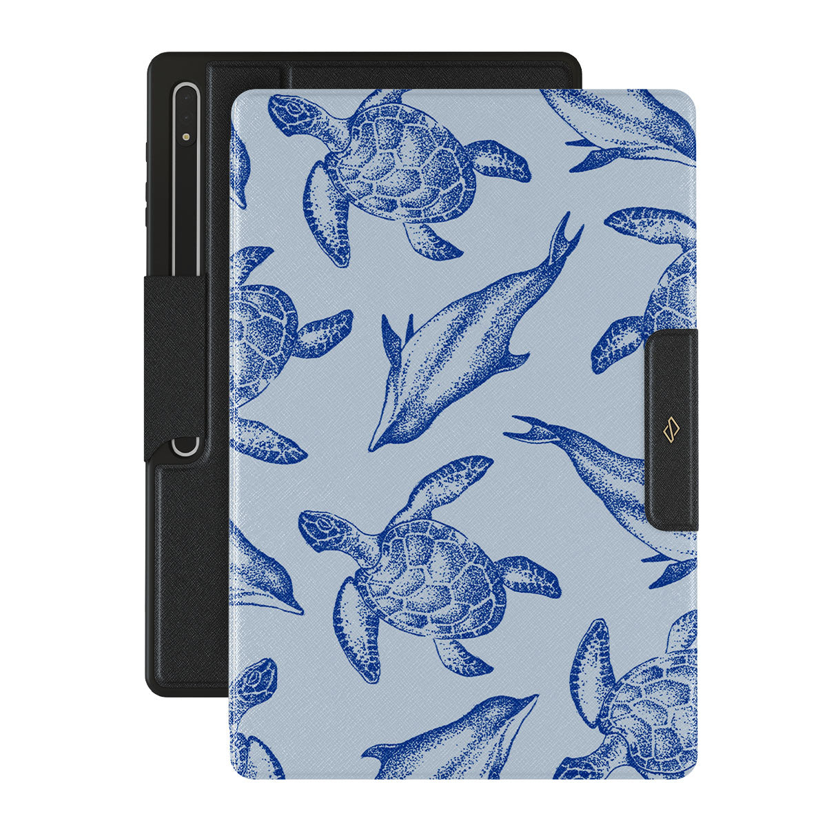 A beautiful design featuring lively turtles and dolphins playfully dancing in serene light blue water. Dive into the ocean's rhythm with our Aquatic Dance Samsung Galaxy Tab S9 Ultra folio case.