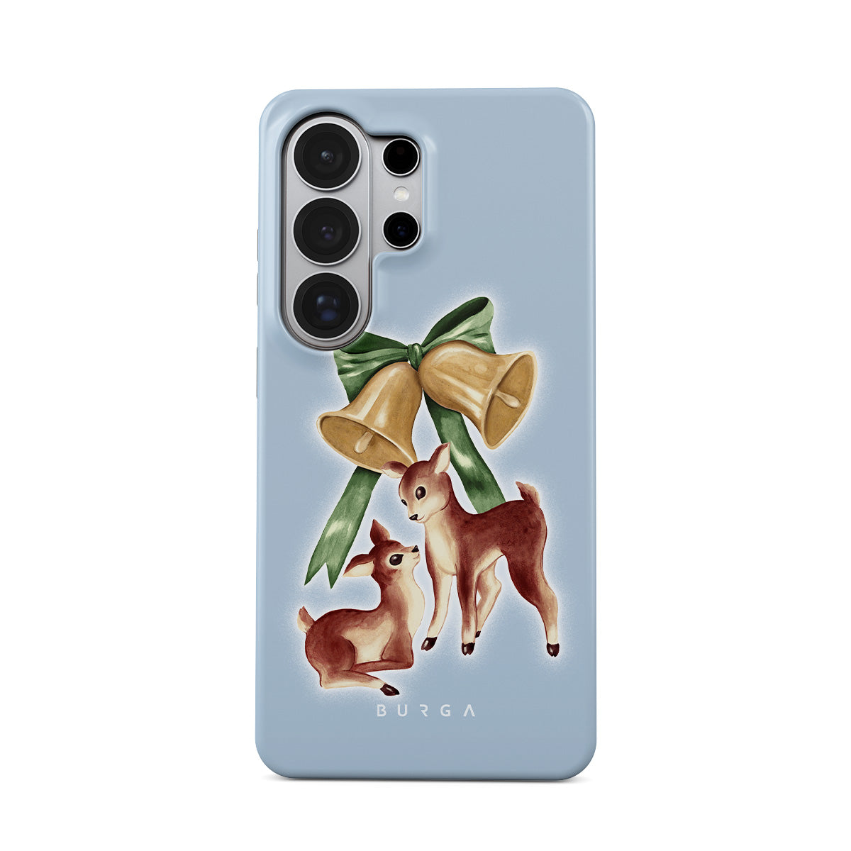 This design features: vintage reindeer, Christmas bells, golden bells, retro reindeer illustration, baby deer, light blue background
