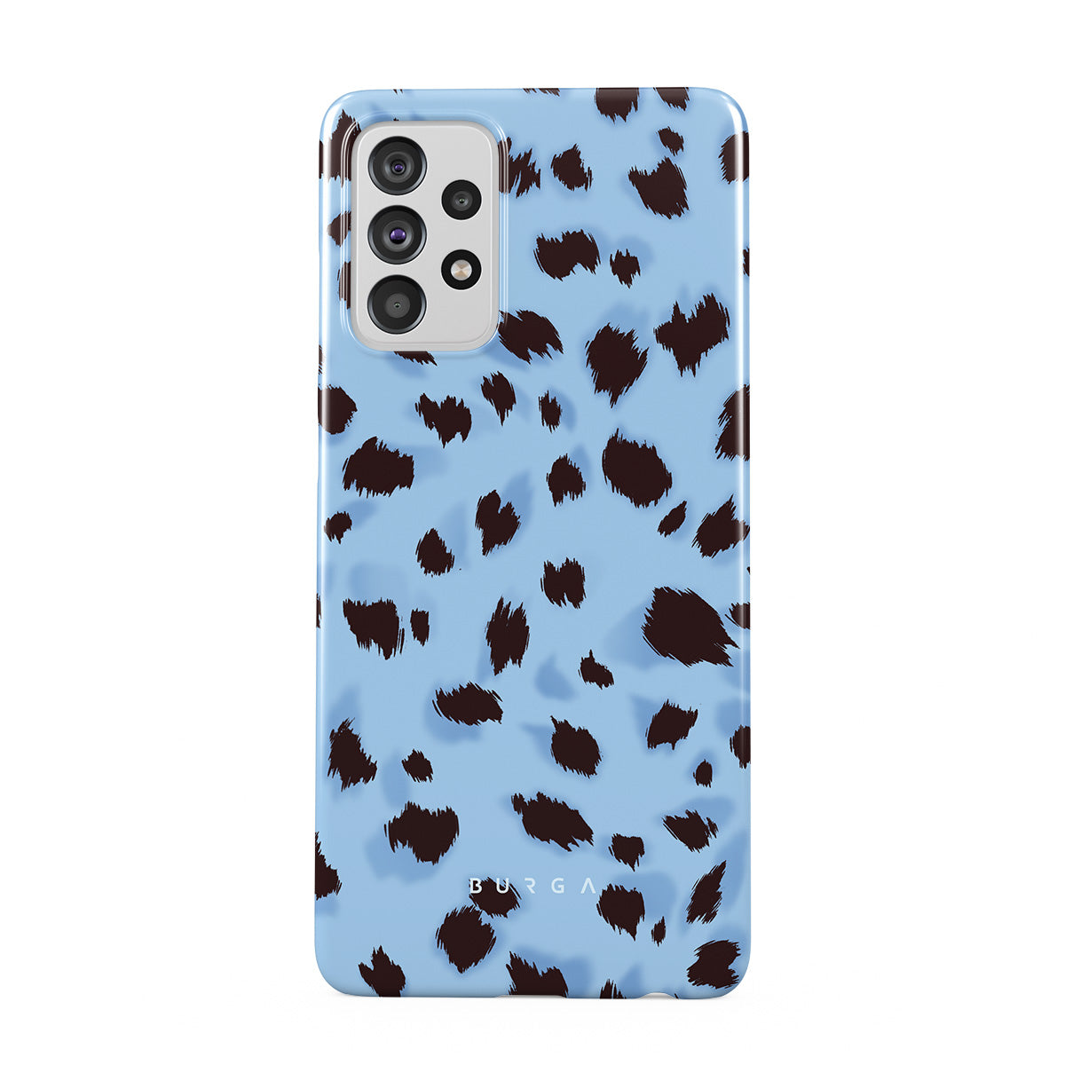 This design features: light blue background, animal print