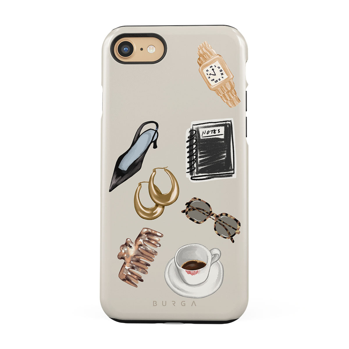 This design features: black high heel, gold hoop earrings, black notebook, coffee cup, tortoiseshell glasses, brown scrunchie, retro gold watch