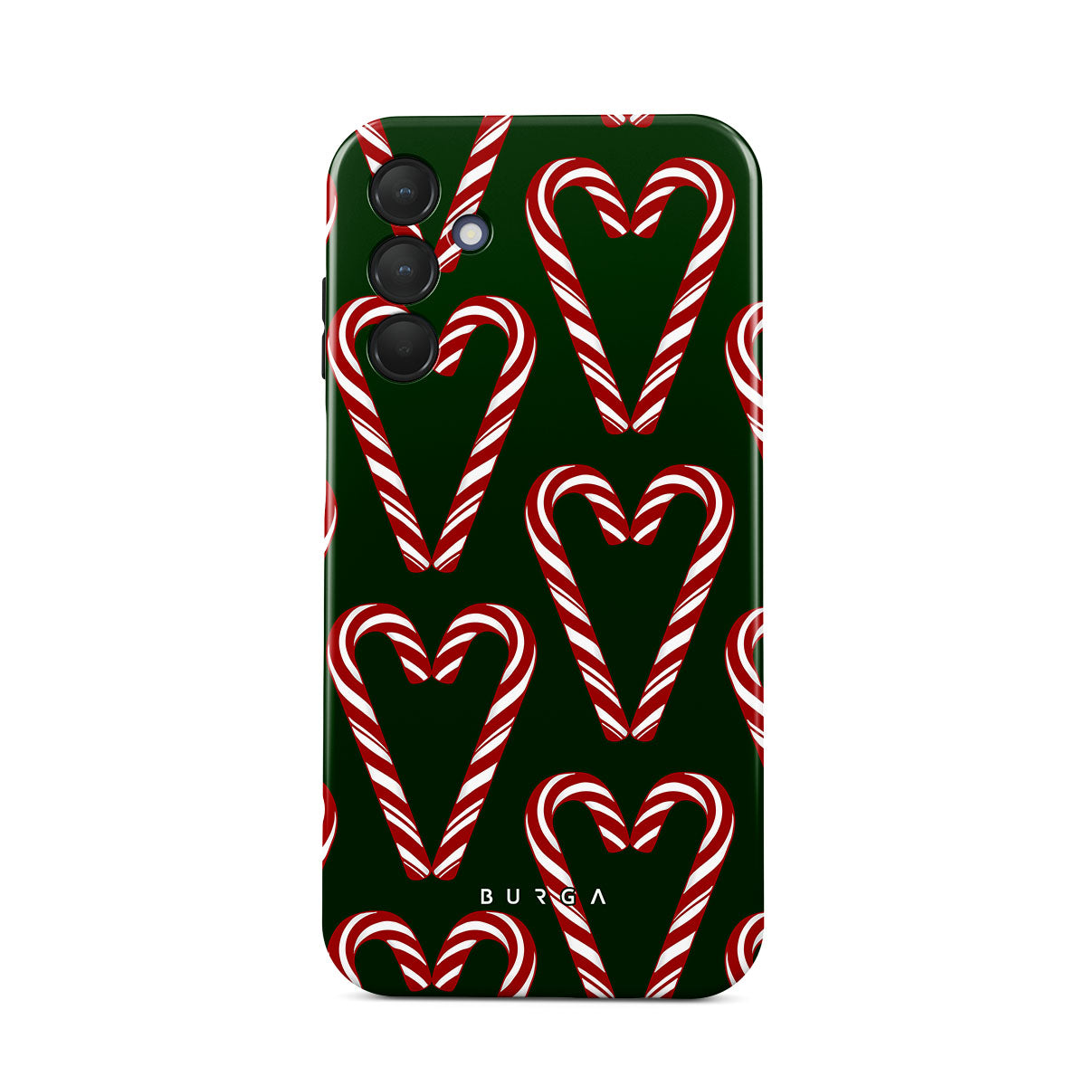 Vibrant and playful, our Candy Cane Samsung Galaxy A15 4G / 5G Case phone case design showcases candy cane heart motifs against a dark green background—a delightful choice for those who love a touch of whimsy and nostalgia.