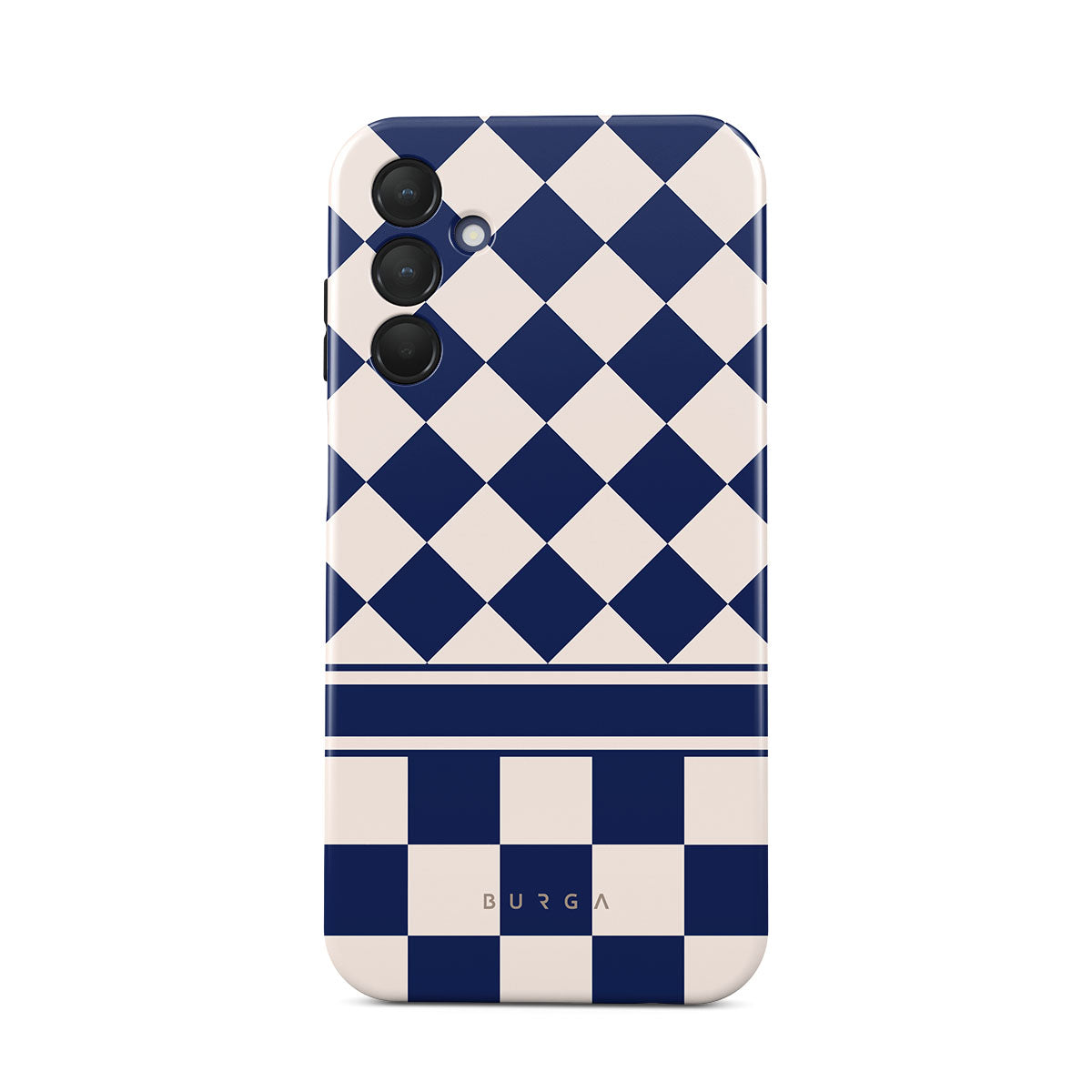 Embrace the essence of subtle luxury with our Check & Mate Samsung Galaxy A15 4G / 5G phone case design. Blending eggshell and deep blue checkers, it evokes whispers of elegance. While diamonds grace the upper half, the lower half features a timeless chessboard pattern.