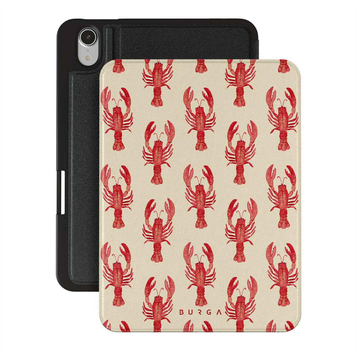 This design features: red lobstersFeatures