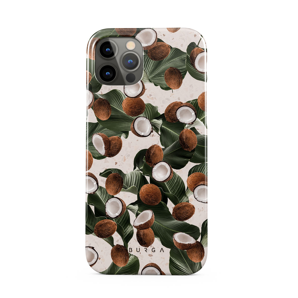 Coconut Crush iPhone 12 Pro Max phone case showcases a soft creme color design with a playful addition of coconuts on top. The unexpected design duo will add a touch of tropical playfulness to your style while offering heavy-duty protection for your cell phone.