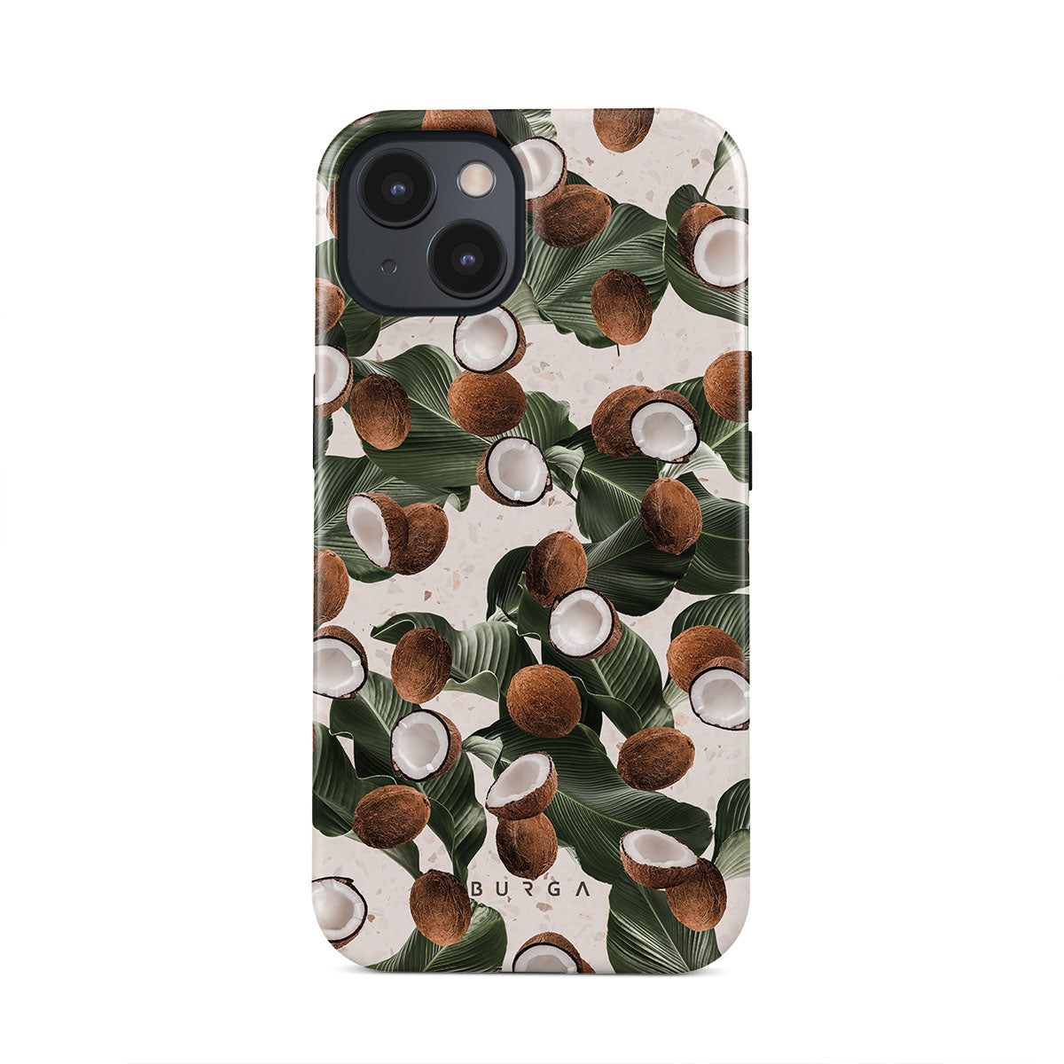 Coconut Crush iPhone 13 Mini phone case showcases a soft creme color design with a playful addition of coconuts on top. The unexpected design duo will add a touch of tropical playfulness to your style while offering heavy-duty protection for your cell phone.