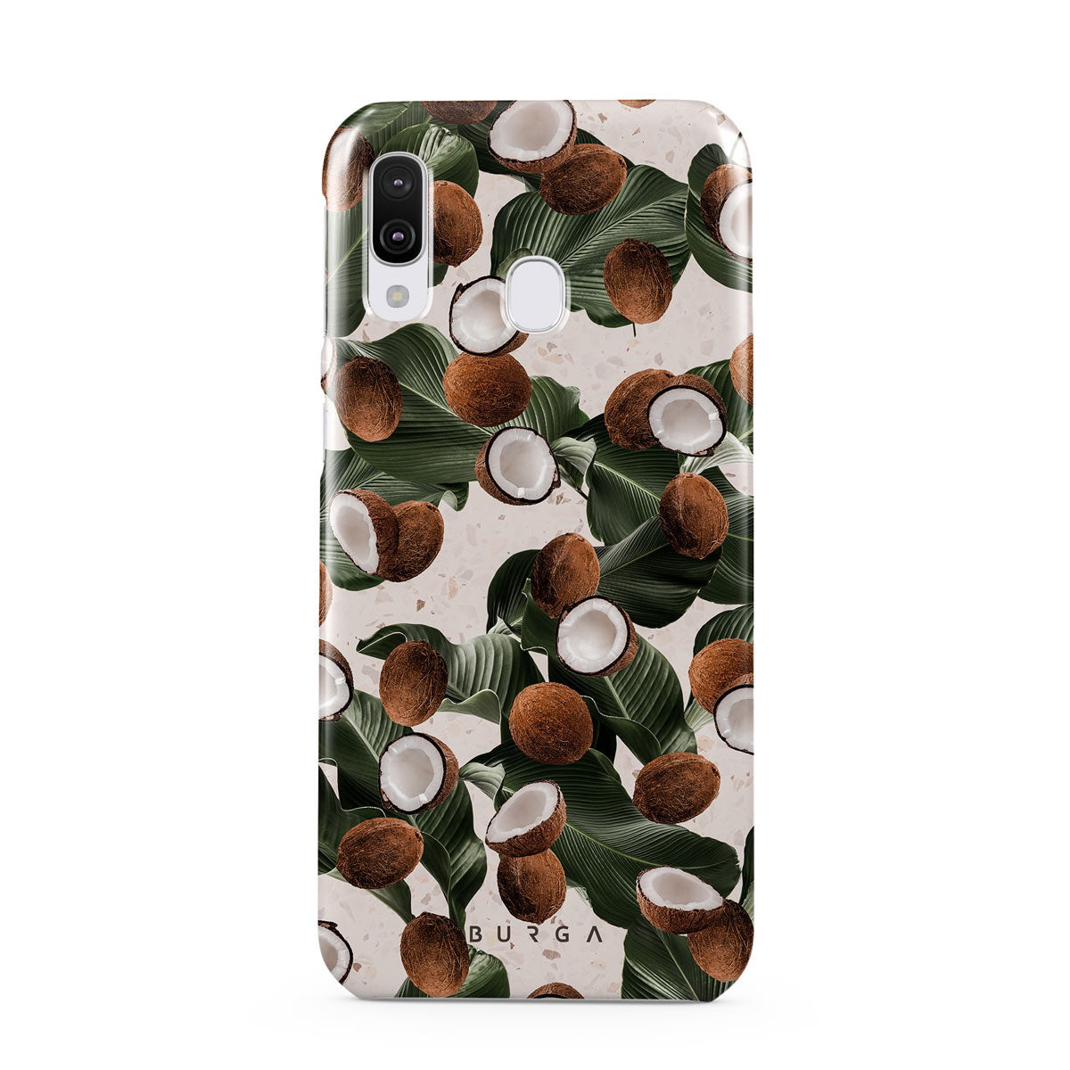 Coconut Crush Samsung Galaxy A40 phone case showcases a soft creme color design with a playful addition of coconuts on top. The unexpected design duo will add a touch of tropical playfulness to your style while offering heavy-duty protection for your cell phone.