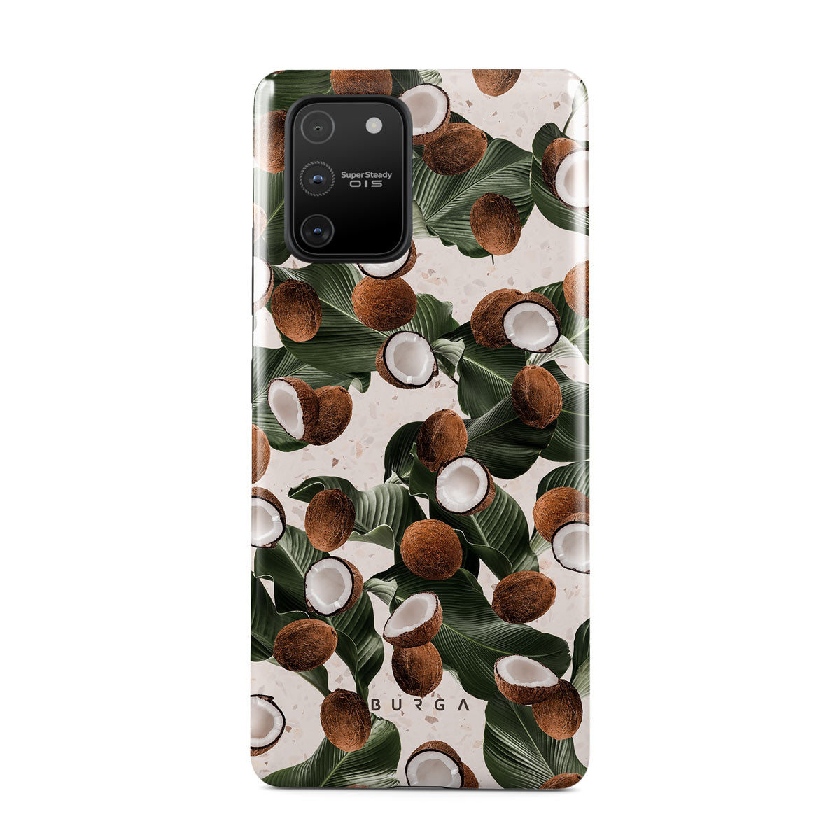 Coconut Crush Samsung Galaxy S10 Lite phone case showcases a soft creme color design with a playful addition of coconuts on top. The unexpected design duo will add a touch of tropical playfulness to your style while offering heavy-duty protection for your cell phone.
