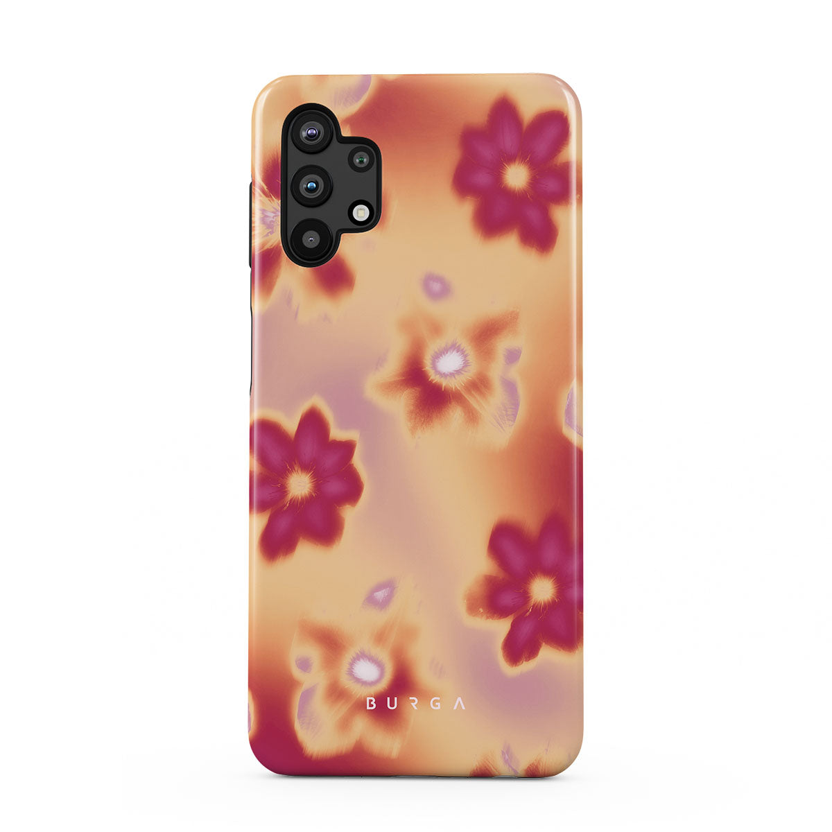 Get lost in the allure of our Divine Samsung Galaxy A32 5G phone case design. Picture blossoms bathed in fiery hues of pink and orange, each seemingly charged with life's raw energy. Set against a canvas that radiates power and warmth, these flowers offer more than just beauty; they resonate with the essence that binds us all.