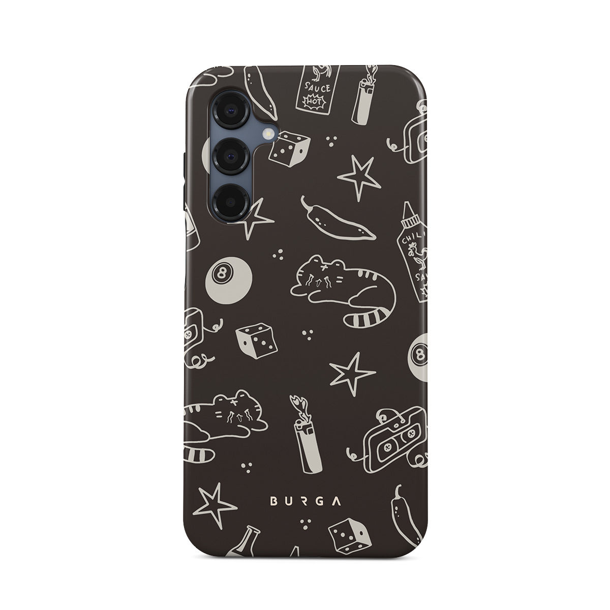 This design features: brown background, playful doodles, cats, stars, pepper, dice, pool ball, mix tape