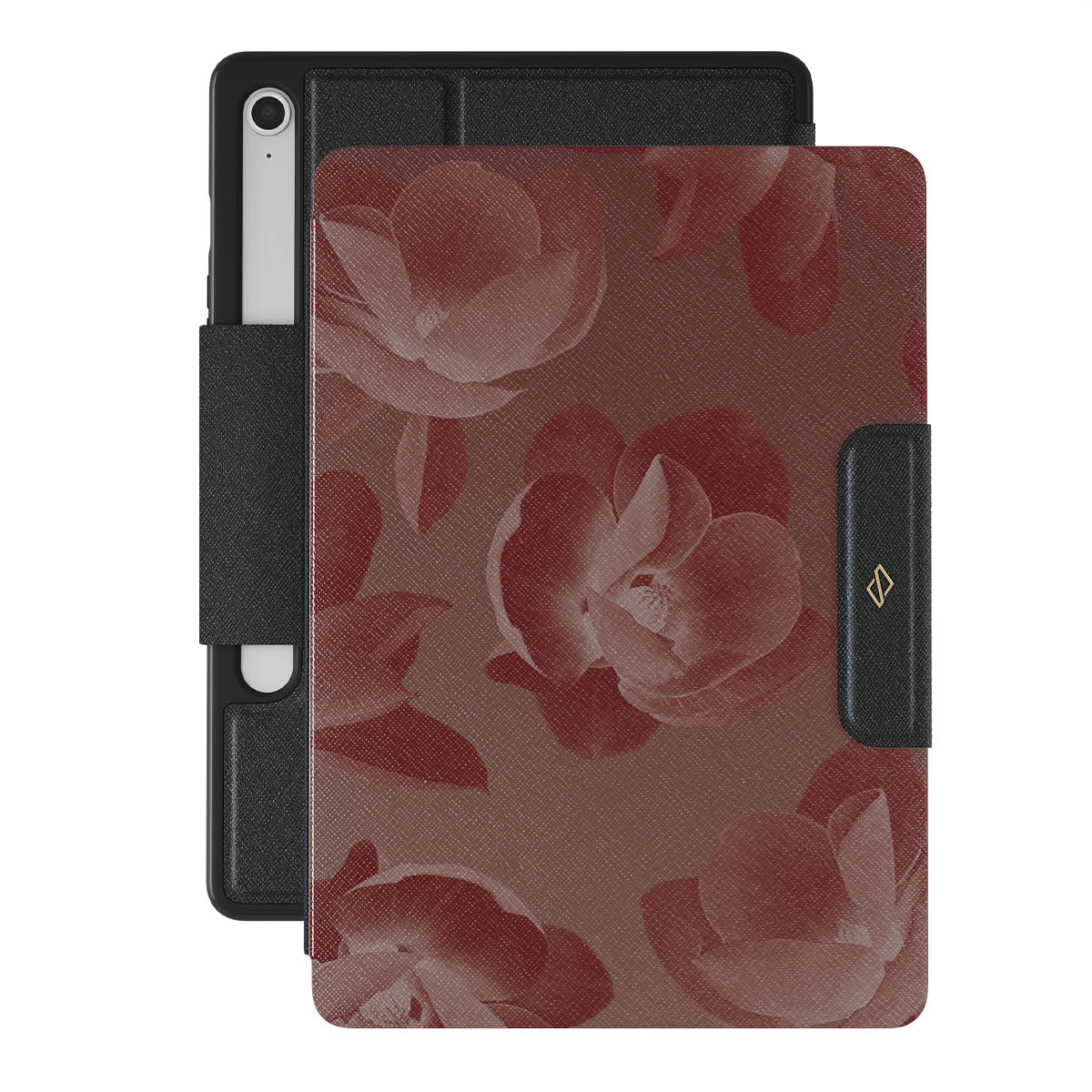 This design features: blooming roses, deep red hues.