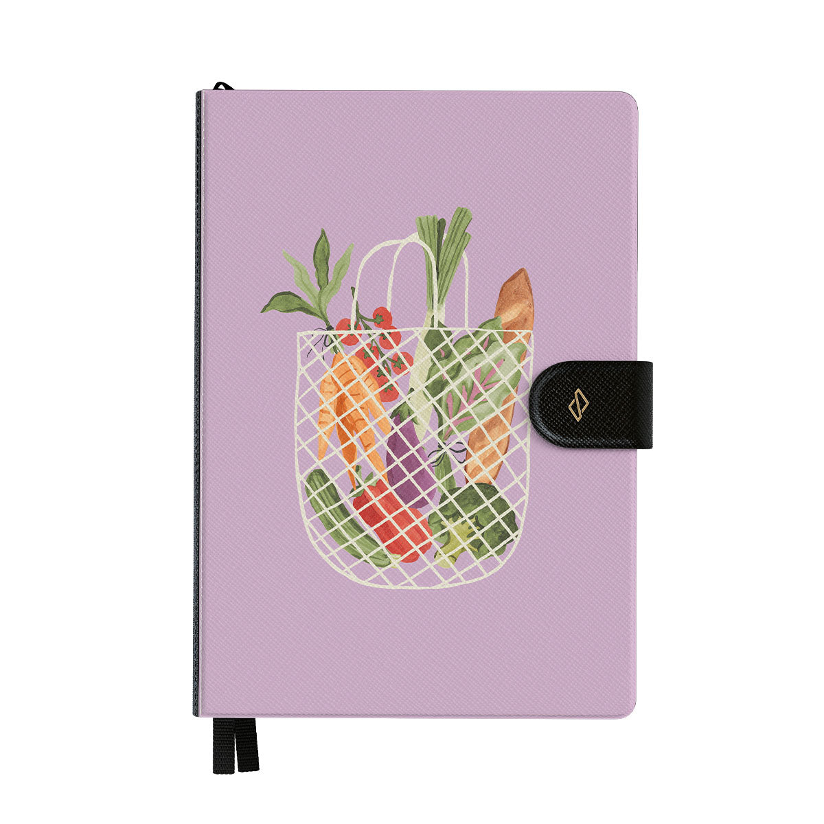This design features: vegetables, market bag, colorful food illustration