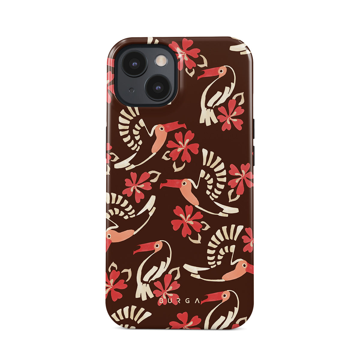 A jungle rave. Parrots, florals, bursts of red and cream—like someone threw a party in the rainforest and forgot to send you the invite. This iPhone 13 phone case design is your RSVP.