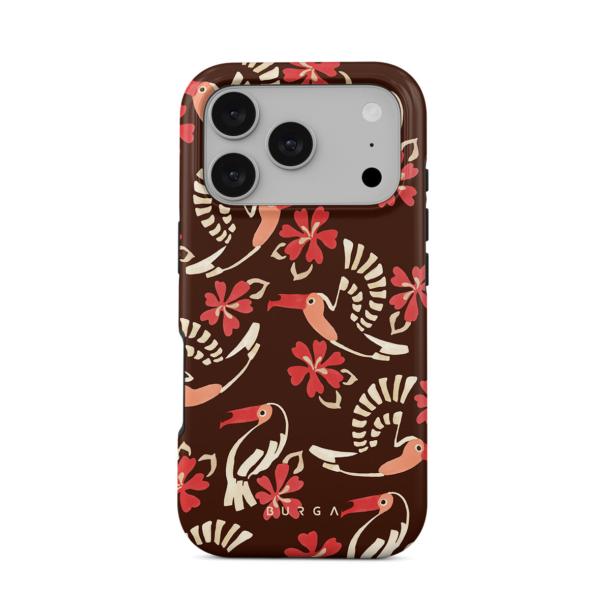 A jungle rave. Parrots, florals, bursts of red and cream—like someone threw a party in the rainforest and forgot to send you the invite. This iPhone 17 Pro phone case design is your RSVP.