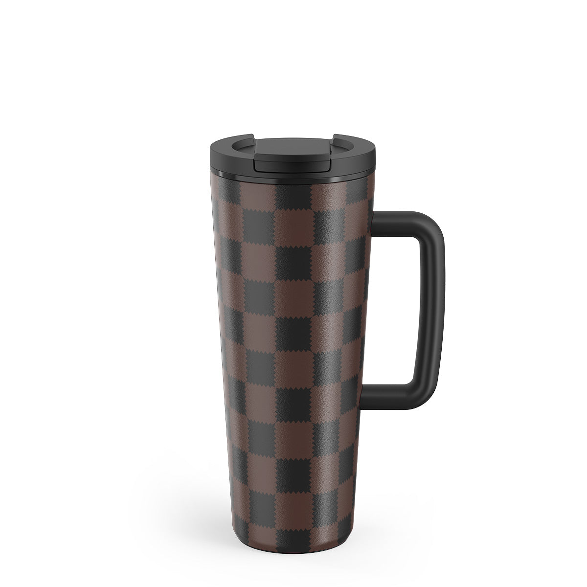 This design features: checkered pattern, brown and dark tones, geometric