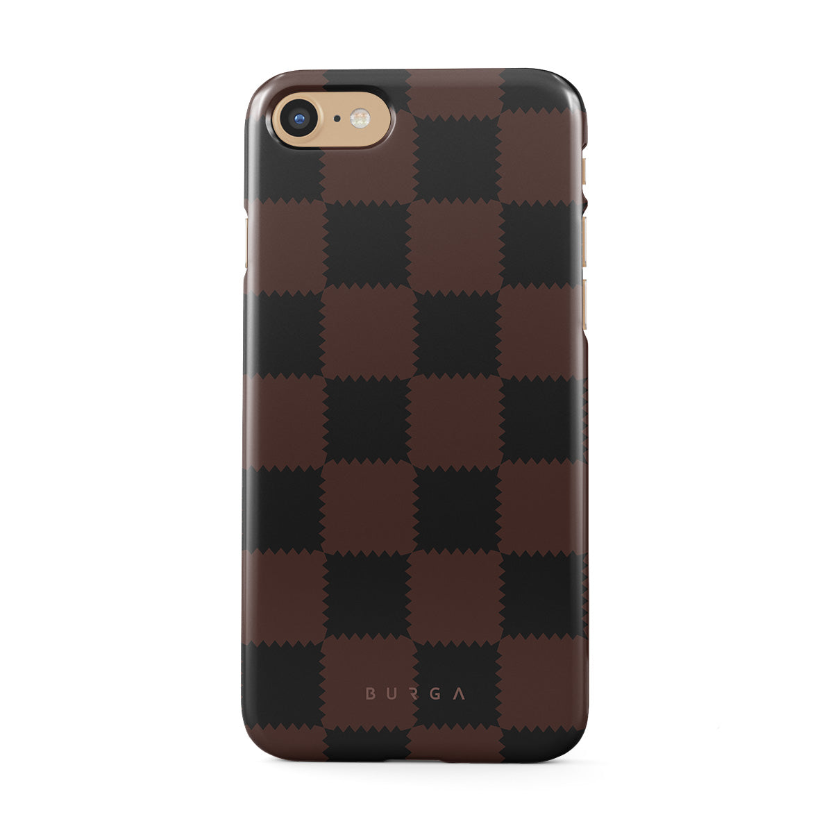 This design features: checkered pattern, brown and dark tones, geometric