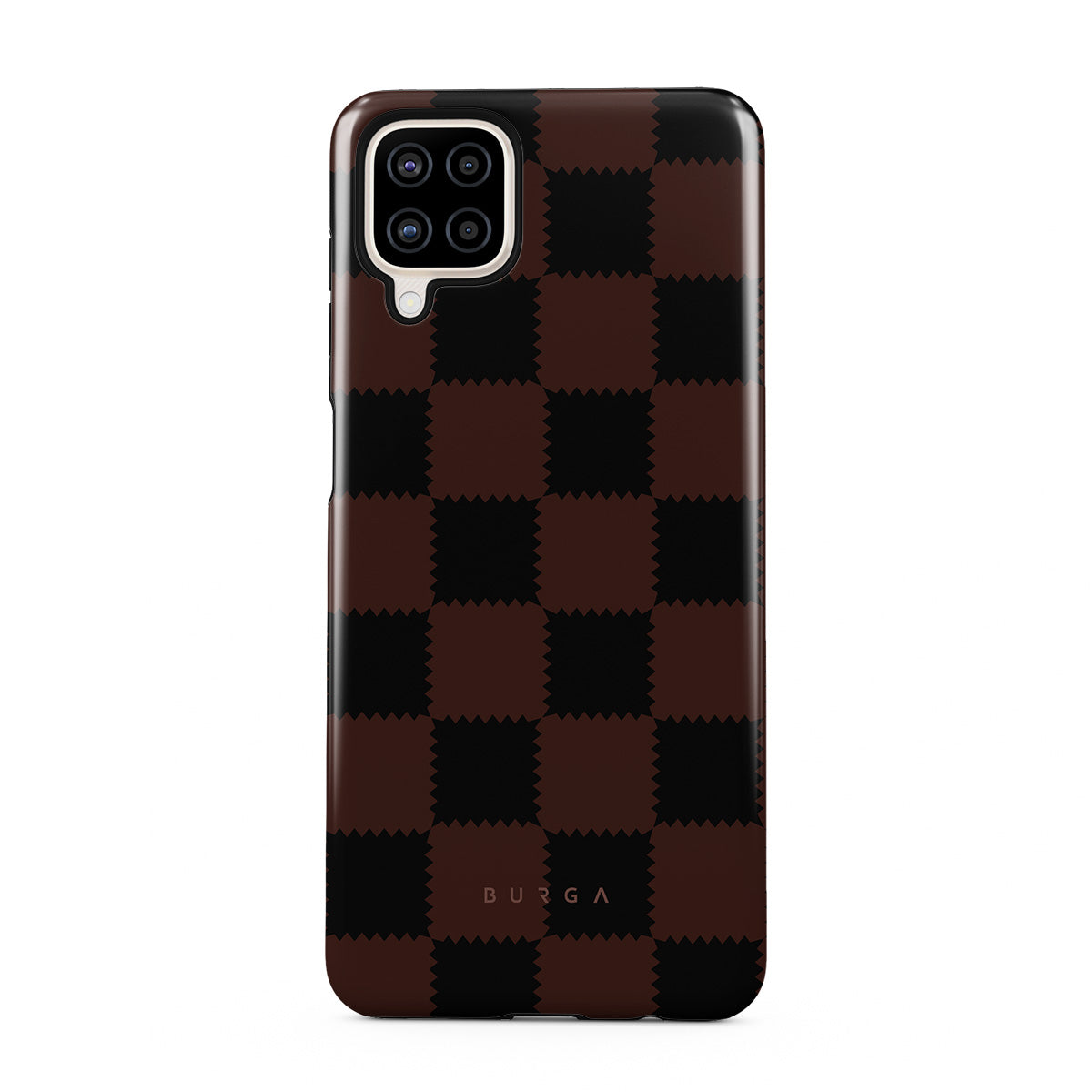 This design features: checkered pattern, brown and dark tones, geometric