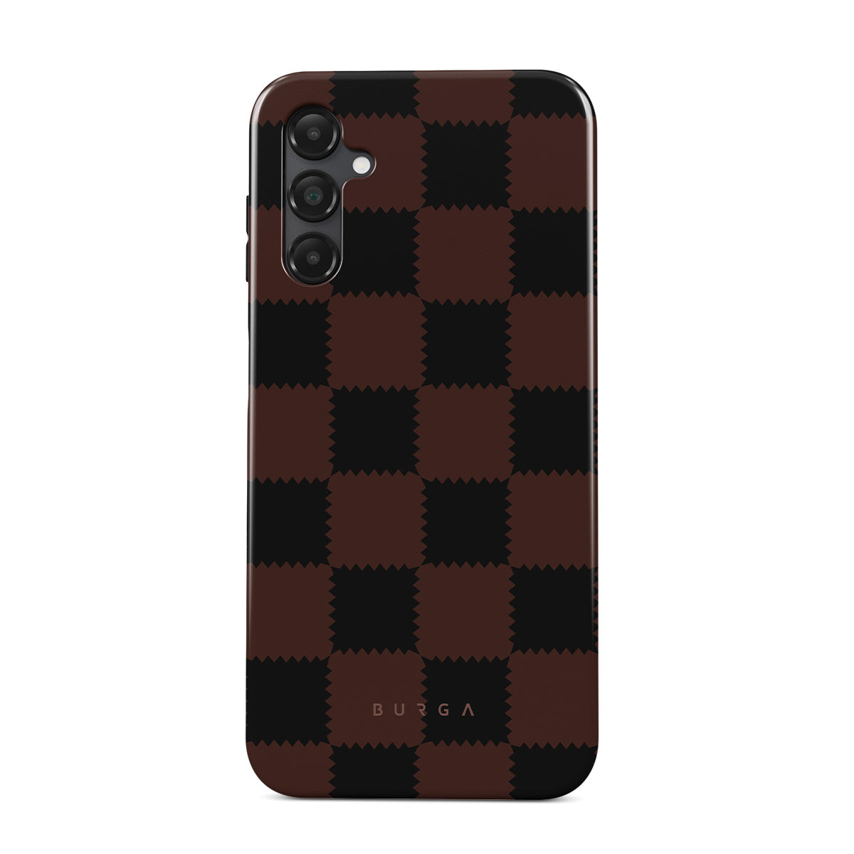 This design features: checkered pattern, brown and dark tones, geometric