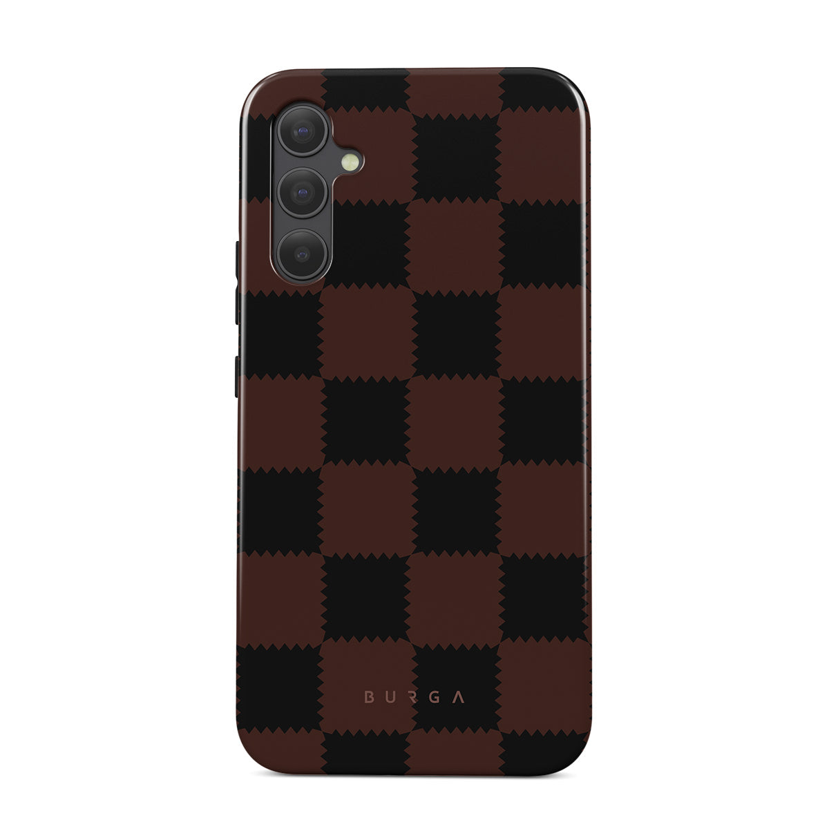 This design features: checkered pattern, brown and dark tones, geometric