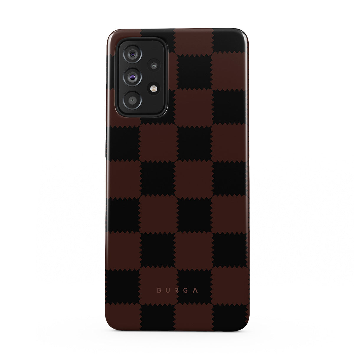 This design features: checkered pattern, brown and dark tones, geometric