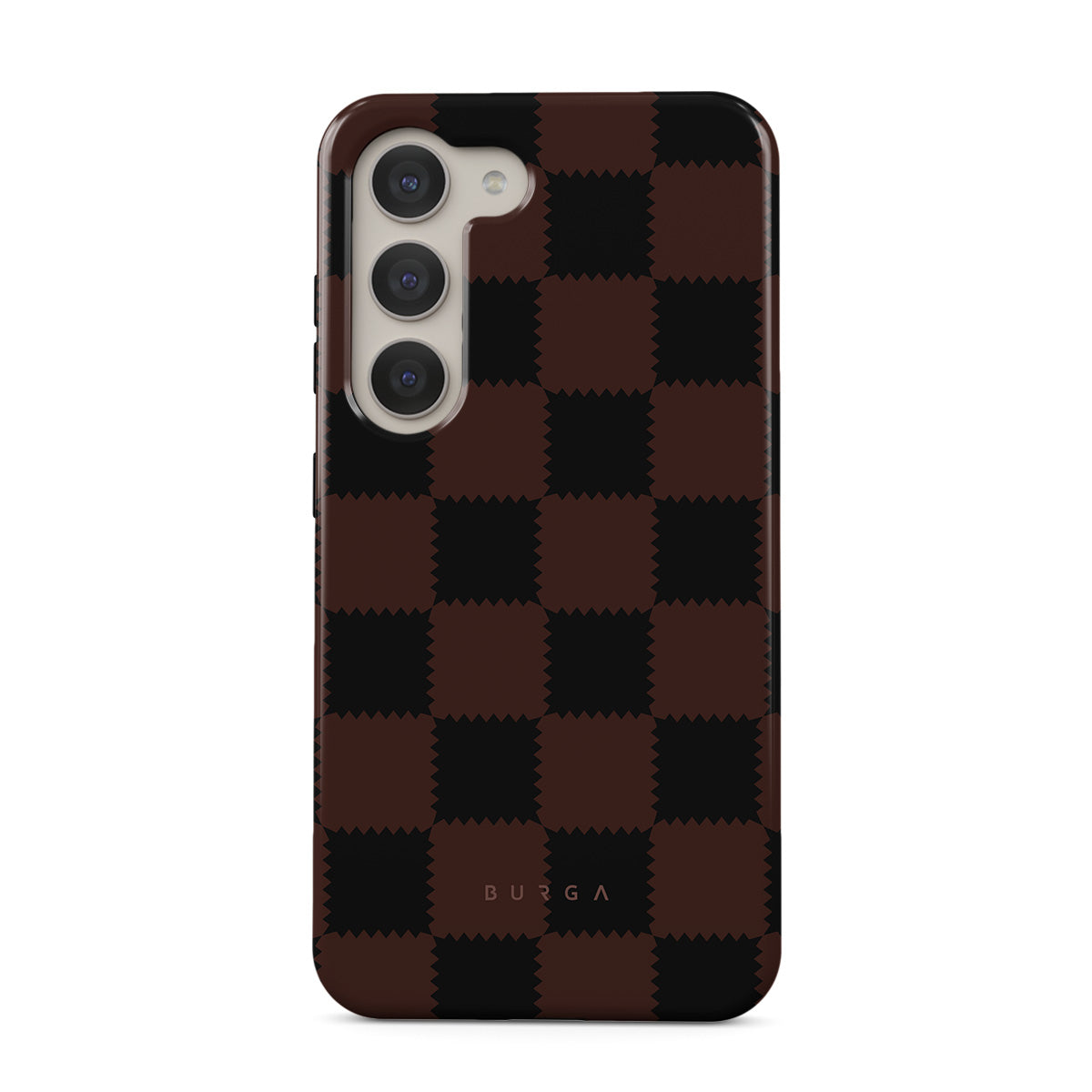 This design features: checkered pattern, brown and dark tones, geometric