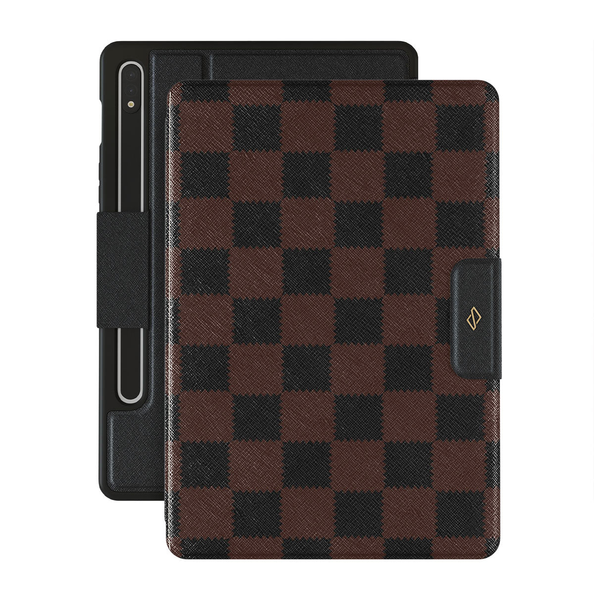 This design features: checkered pattern, brown and dark tones, geometric