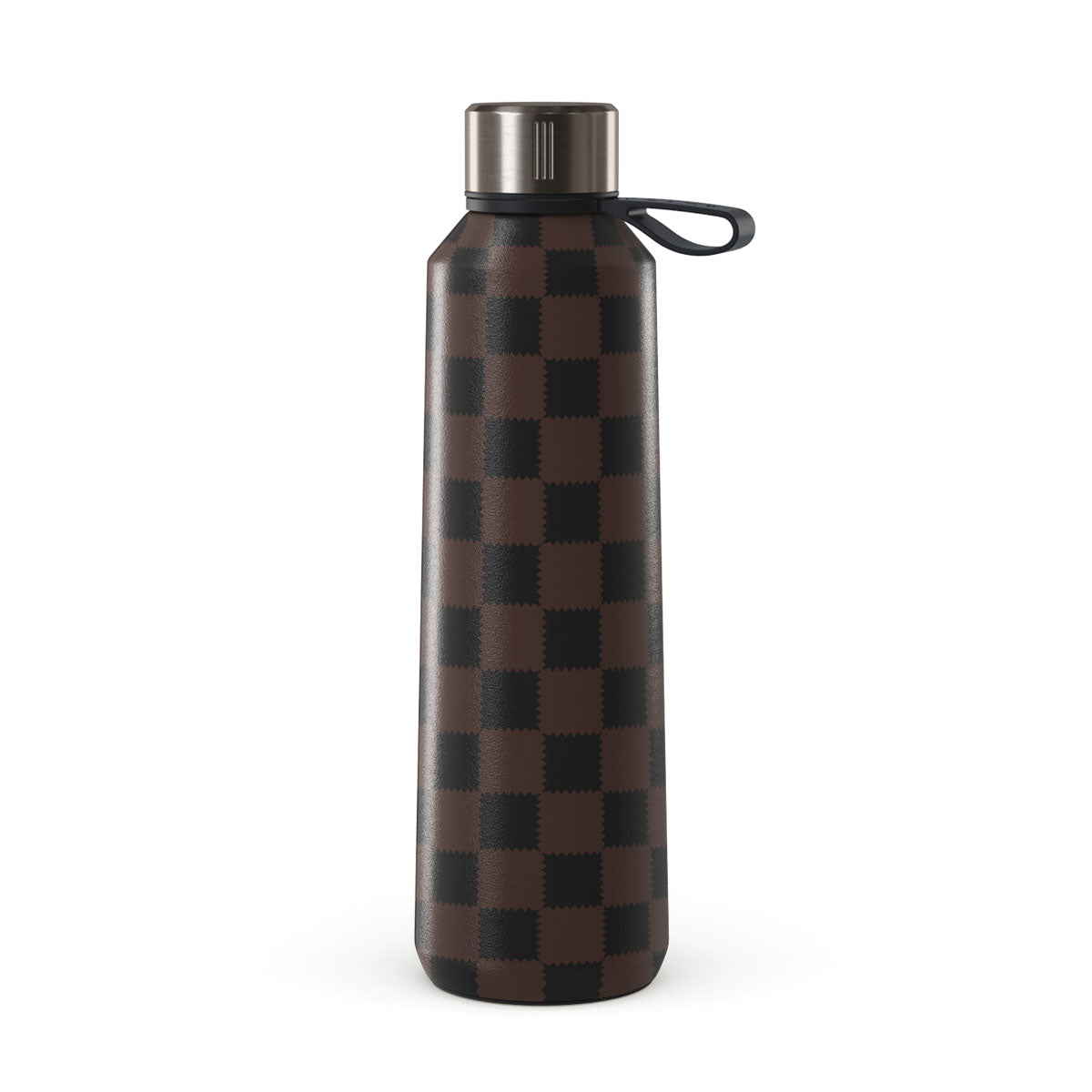 This design features: checkered pattern, brown and dark tones, geometric