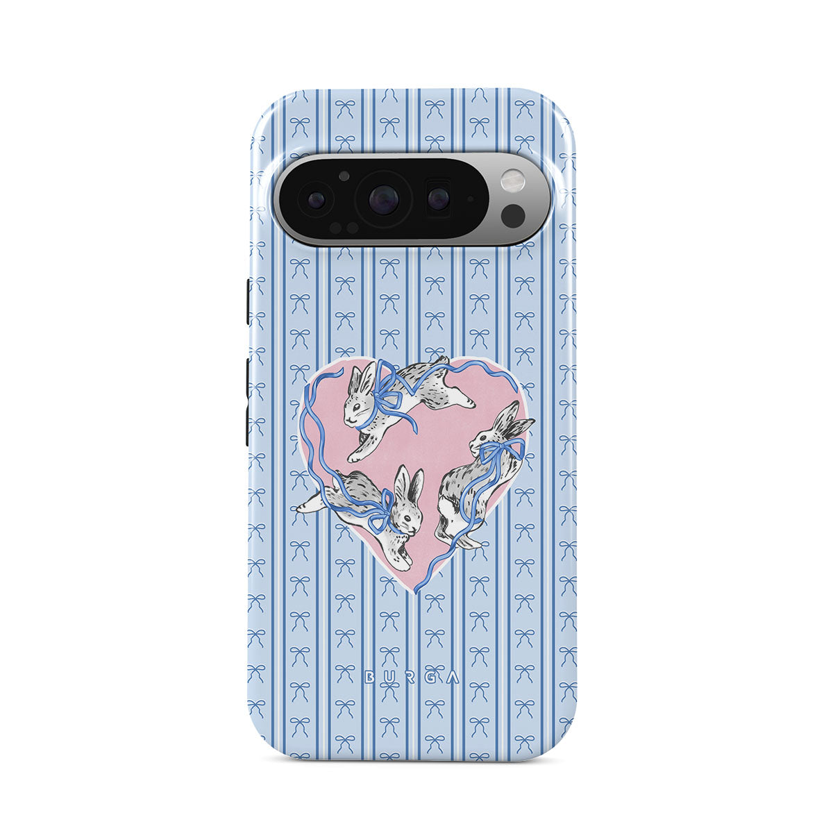 This design features: white rabbits, heart frame, blue stripes
