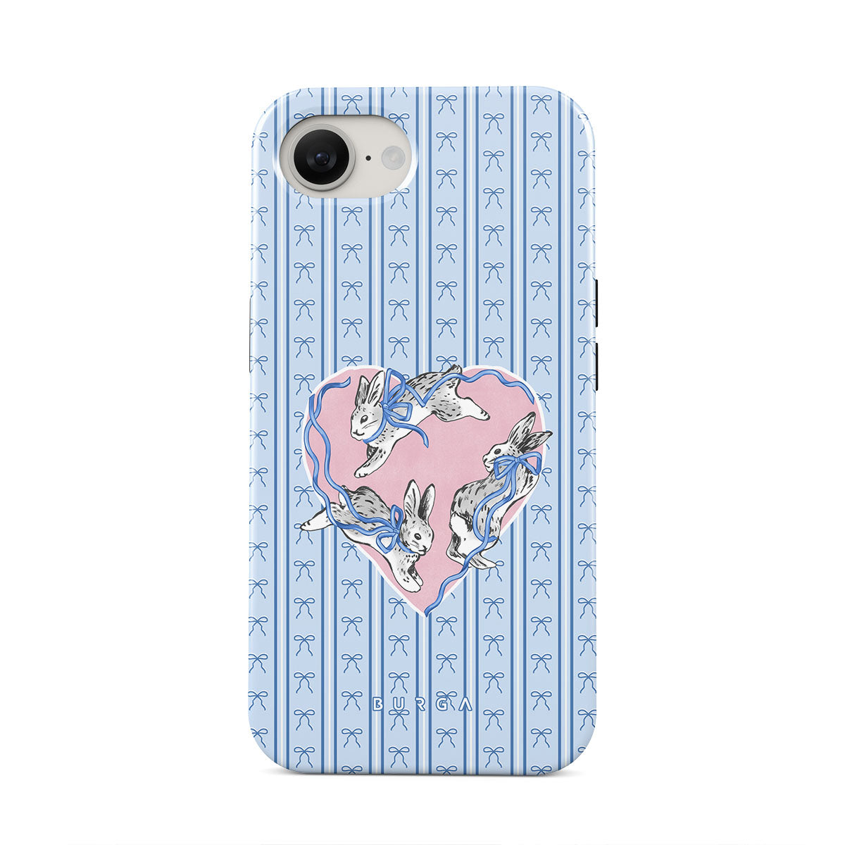 This design features: white rabbits, heart frame, blue stripes