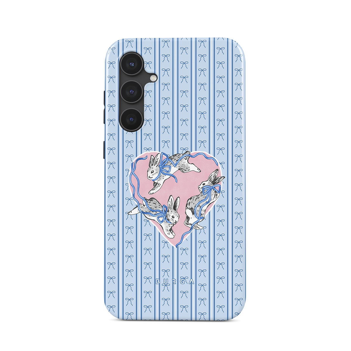 This design features: white rabbits, heart frame, blue stripes