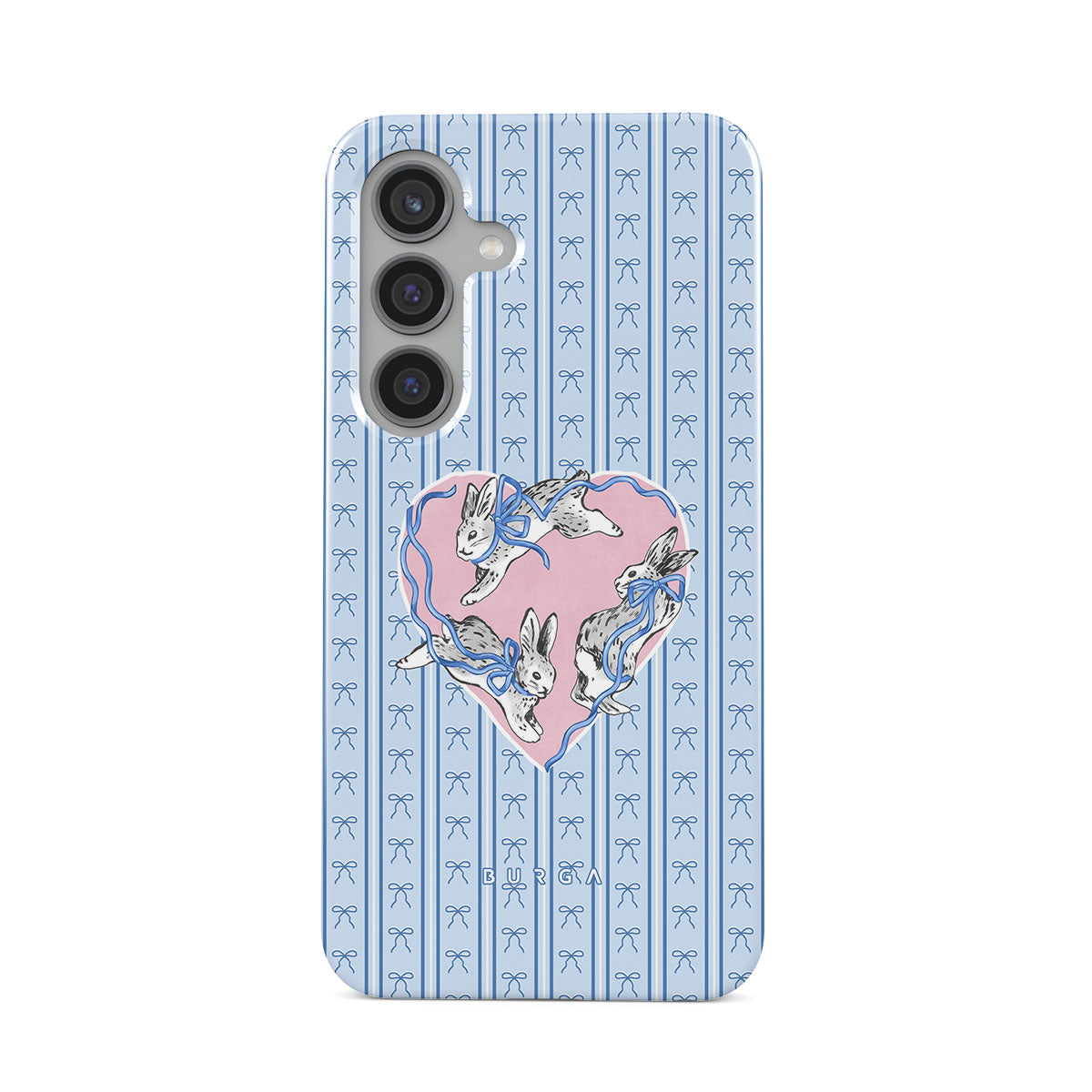 This design features: white rabbits, heart frame, blue stripes