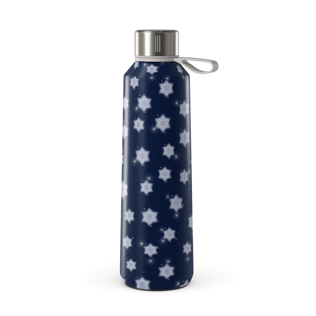 This design features: white snowflakes, navy blue background, winter snowflake pattern, geometric snowflakes, classic winter design