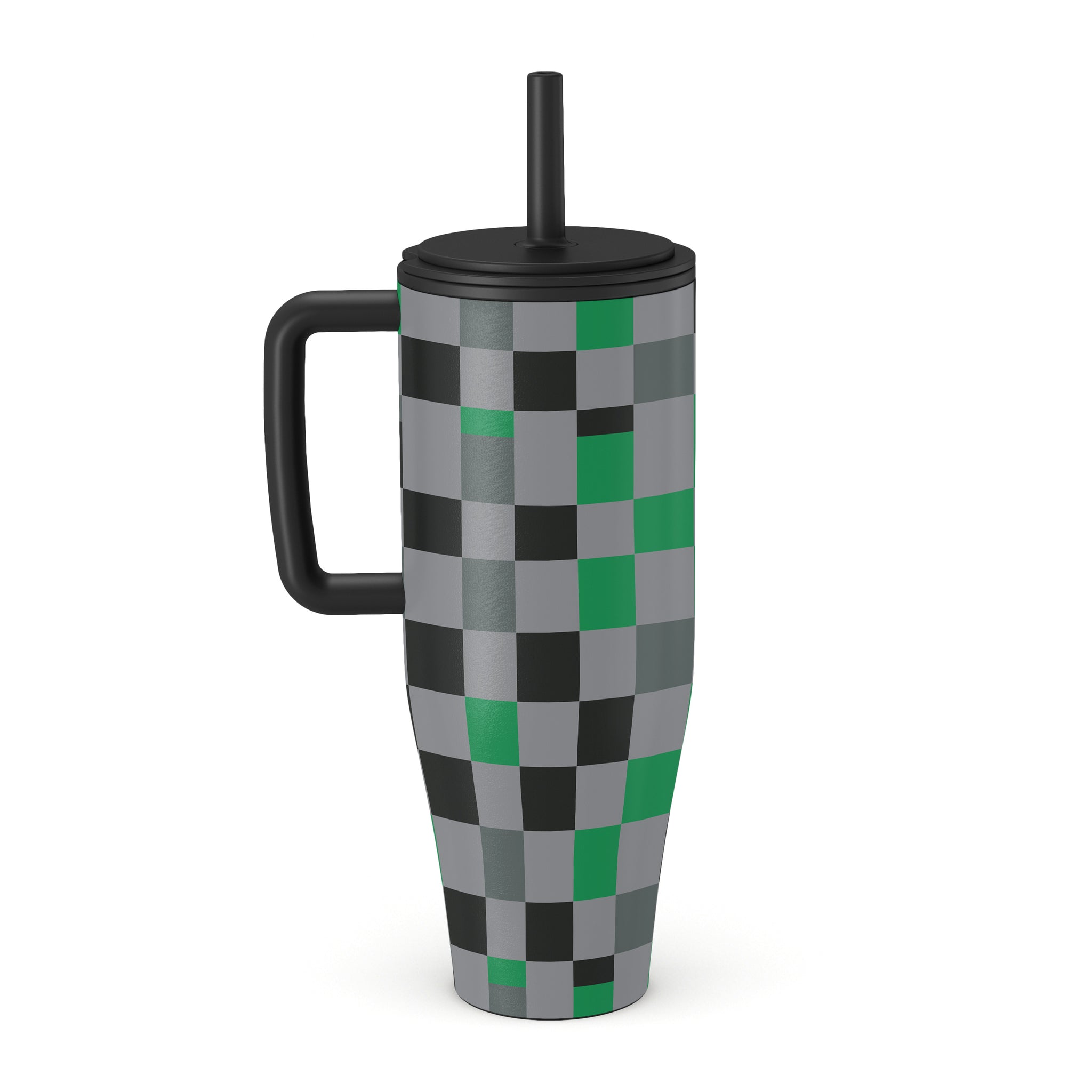 This design features: checkered pattern, green, gray, and black, geometric