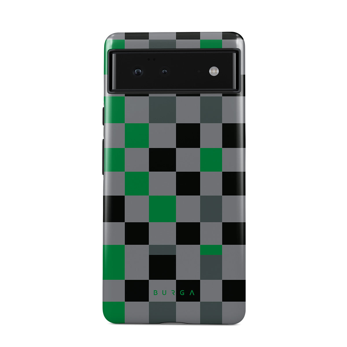 This design features: checkered pattern, green, gray, and black, geometric