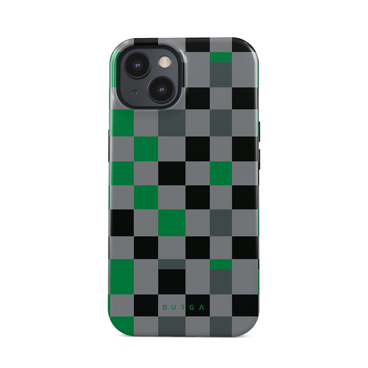 This design features: checkered pattern, green, gray, and black, geometric