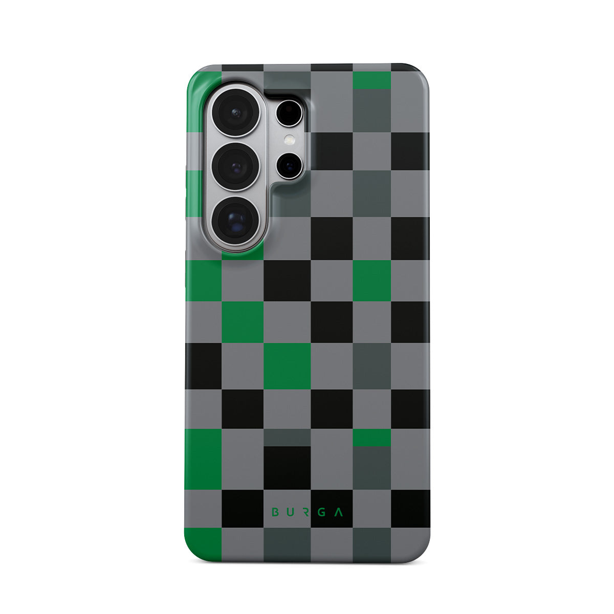 This design features: checkered pattern, green, gray, and black, geometric