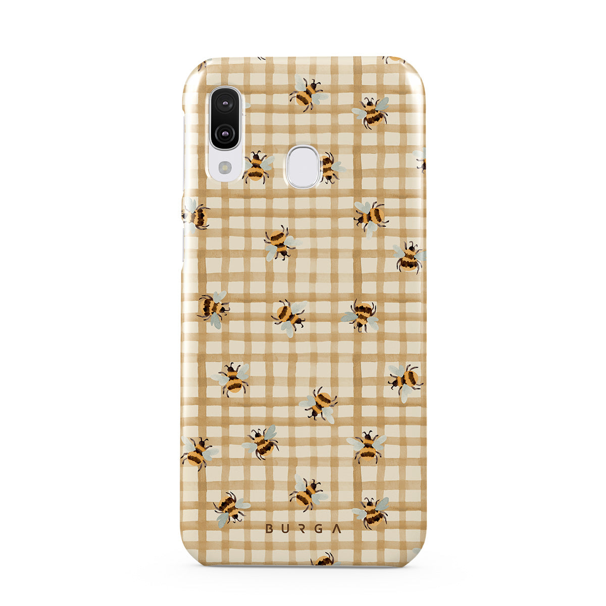 The Samsung Galaxy A40 phone case design is sweet without being cutesy. Bees and checks, yes, but it reads more clever than precious, like nature with good graphic design instincts.