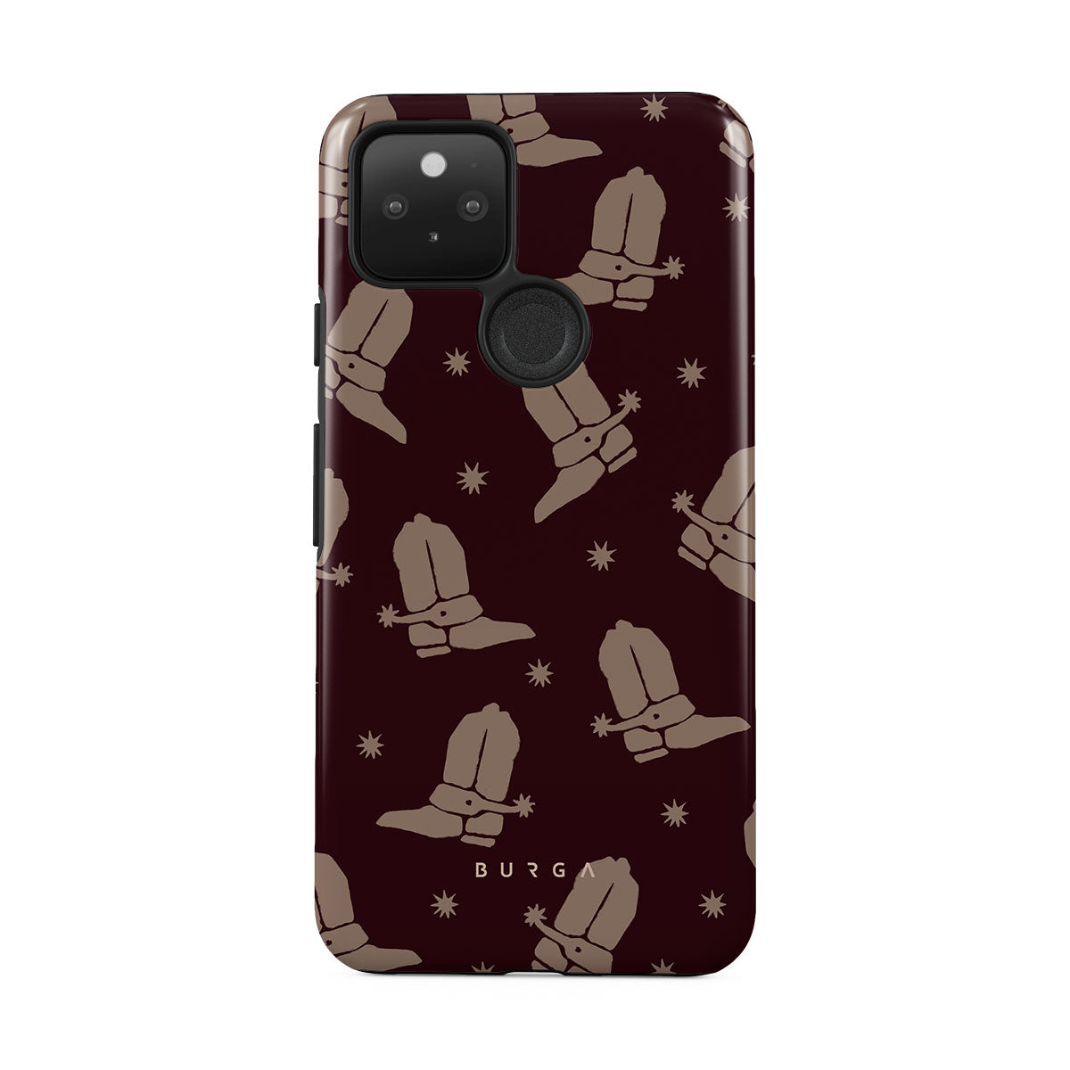 Say Howdy to this charming Google Pixel 5 phone case design. Cowboy boots and stars dance across a deep brown background, celebrating the essence of western life. Perfect for those who embrace their free spirit.