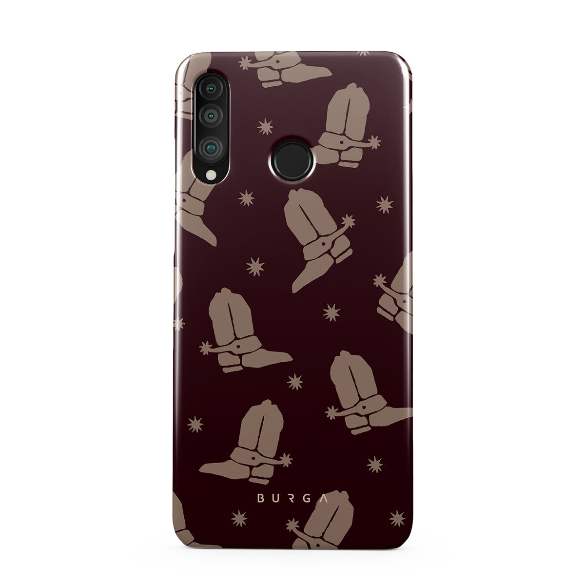 Say Howdy to this charming Huawei P30 Lite phone case design. Cowboy boots and stars dance across a deep brown background, celebrating the essence of western life. Perfect for those who embrace their free spirit.