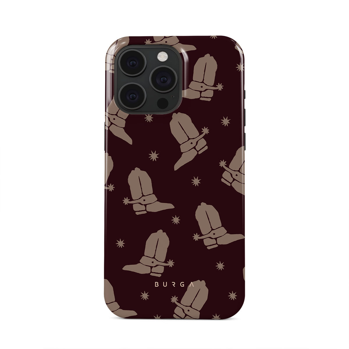 Say Howdy to this charming iPhone 15 Pro Max phone case design. Cowboy boots and stars dance across a deep brown background, celebrating the essence of western life. Perfect for those who embrace their free spirit.