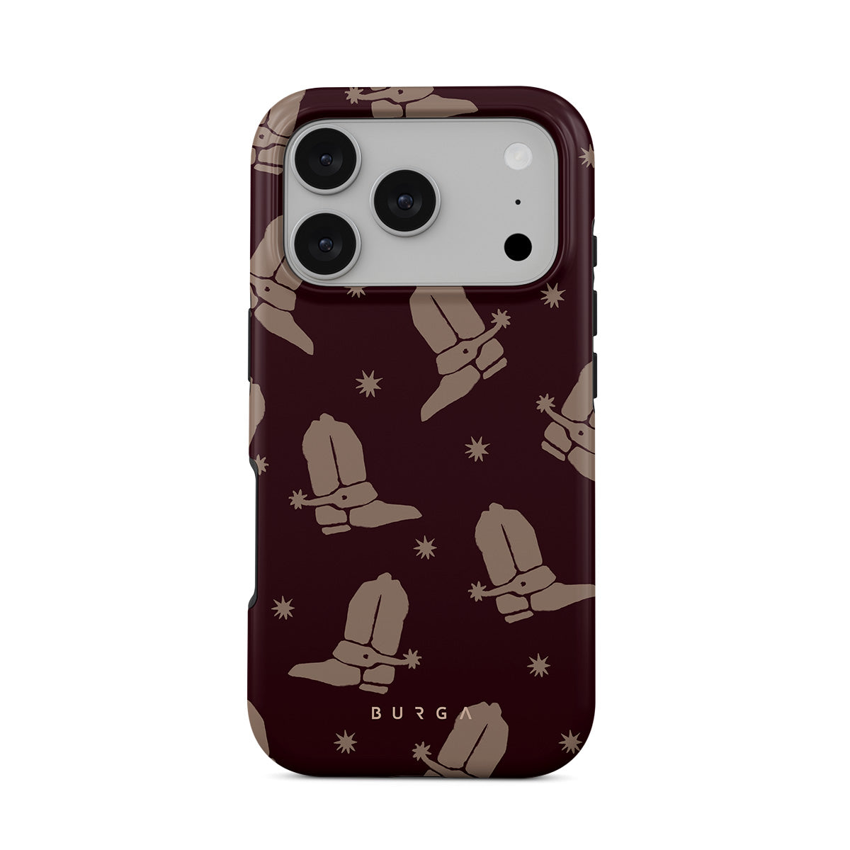 Say Howdy to this charming iPhone 17 Pro phone case design. Cowboy boots and stars dance across a deep brown background, celebrating the essence of western life. Perfect for those who embrace their free spirit.