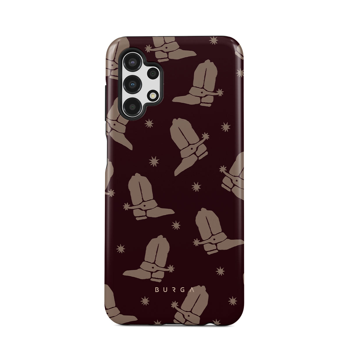 Say Howdy to this charming Samsung Galaxy A13 4G phone case design. Cowboy boots and stars dance across a deep brown background, celebrating the essence of western life. Perfect for those who embrace their free spirit.