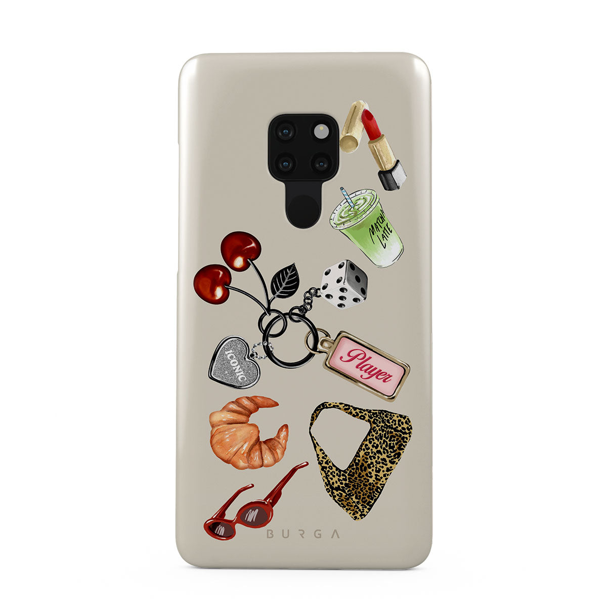 This design features: red sunglasses, red lipstick, green matcha drink, croissant, black dice, leopard-print bag, keychain with silver heart, cherries, dice and "Player" tag
